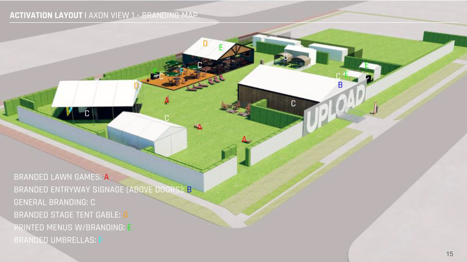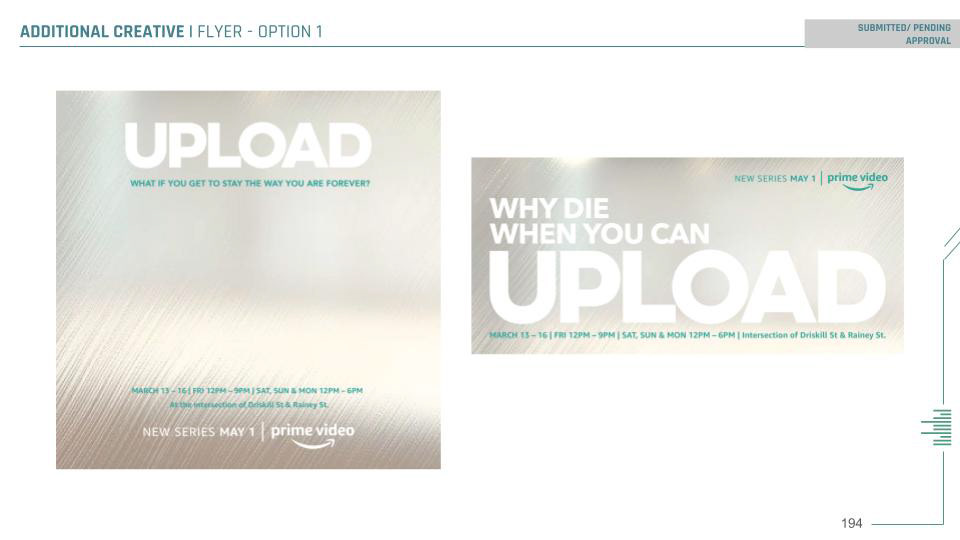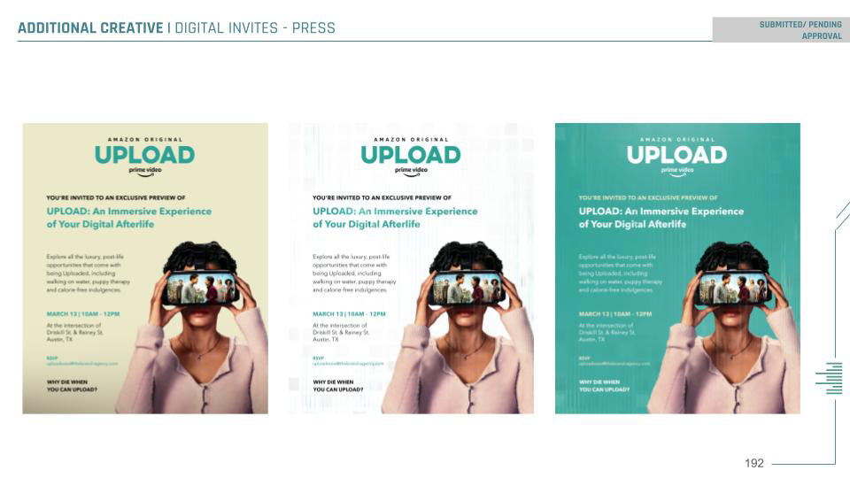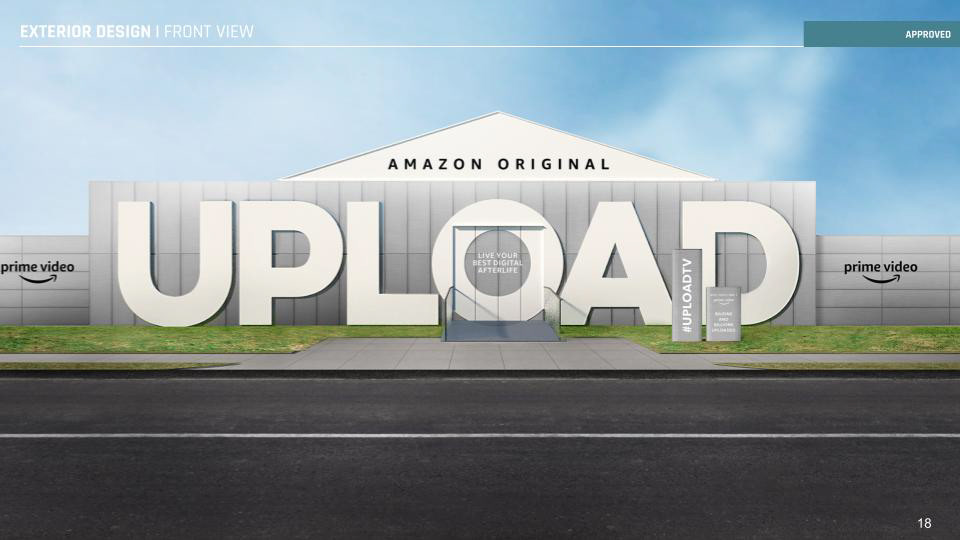 Description \\ A full-block buildout to encompass an immersive experience informed by the Amazon Original TV show UPLOAD. Including live actors, custom buildout, fabrication, light shows, integrated audio, live performances, and photo moments.